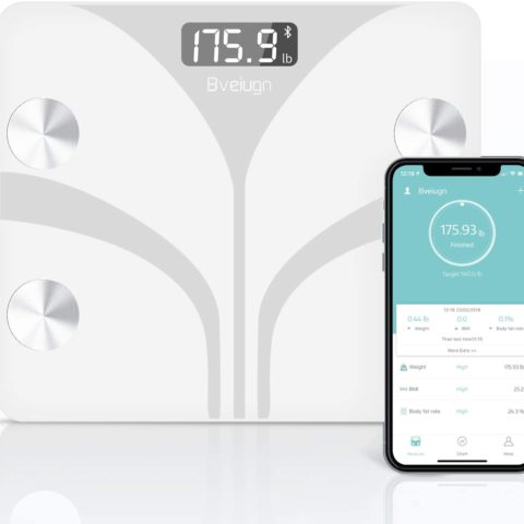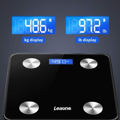 Leaone Body Fat Scale 28x28cm, Blue LCD Display, Smart Bluetooth Digital BMI Weight Scale, Body Composition Analyzer Health Monitor with 6mm Tempered Glass with Smartphone App, 400 lbs, White